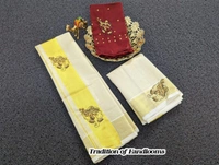 Name : Handcrafted Ganapati Design Kerala Tissue ( Kasavu) Set Mundu (2mtrs Mundu & 2.8mtrs Neriyathu) with Design Blouse| OURPLANET