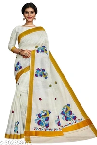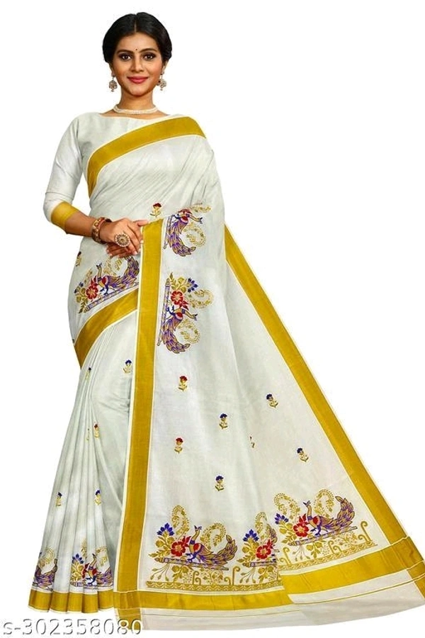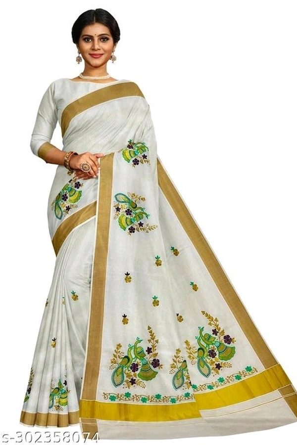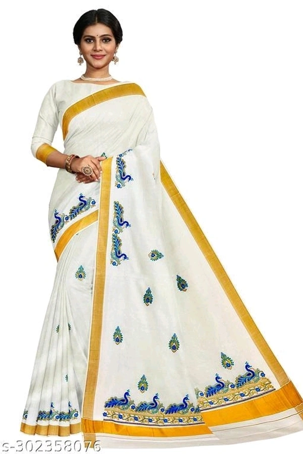 Kerala Embroidery Worked Kasavu Kerala Cotton Saree With Running Blouse