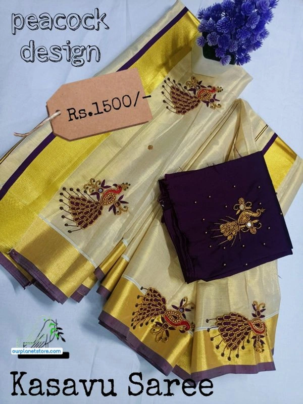 Name : Handcrafted Peacock Design Kerala Tissue ( Kasavu) Set Saree| OURPLANET