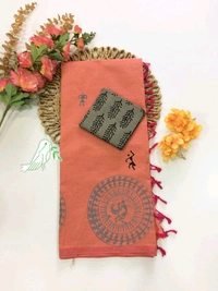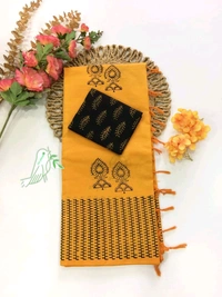 Southcottonmix block printed saree with self and contrast blouse With kunjalayam